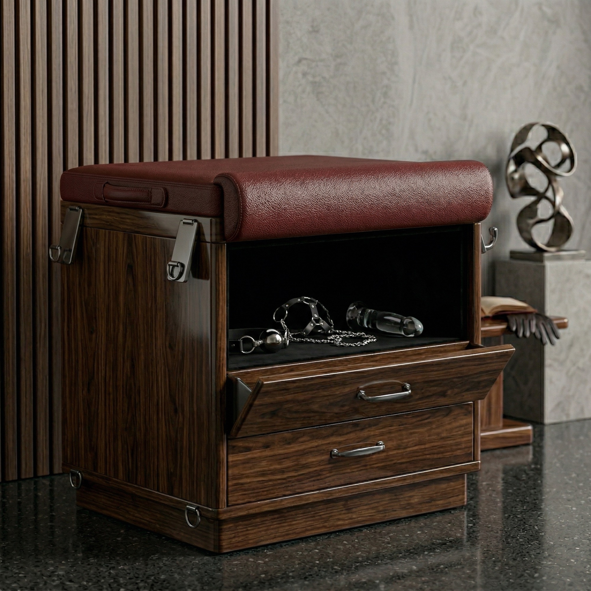 BDSM here stands for bondage, discipline, dominance, submission, sadism and masochism. In practice, that means this build is made for restraint, sensation play, and the convenience of having your entire toy kit within arm’s reach. The internal storage compartment is large enough for floggers, ropes, and impact tools, keeping your gear organized and private. The hidden anchor points are strategically placed to allow for floor-based bondage or seated restraint, all while maintaining a “normal” furniture aesthetic.